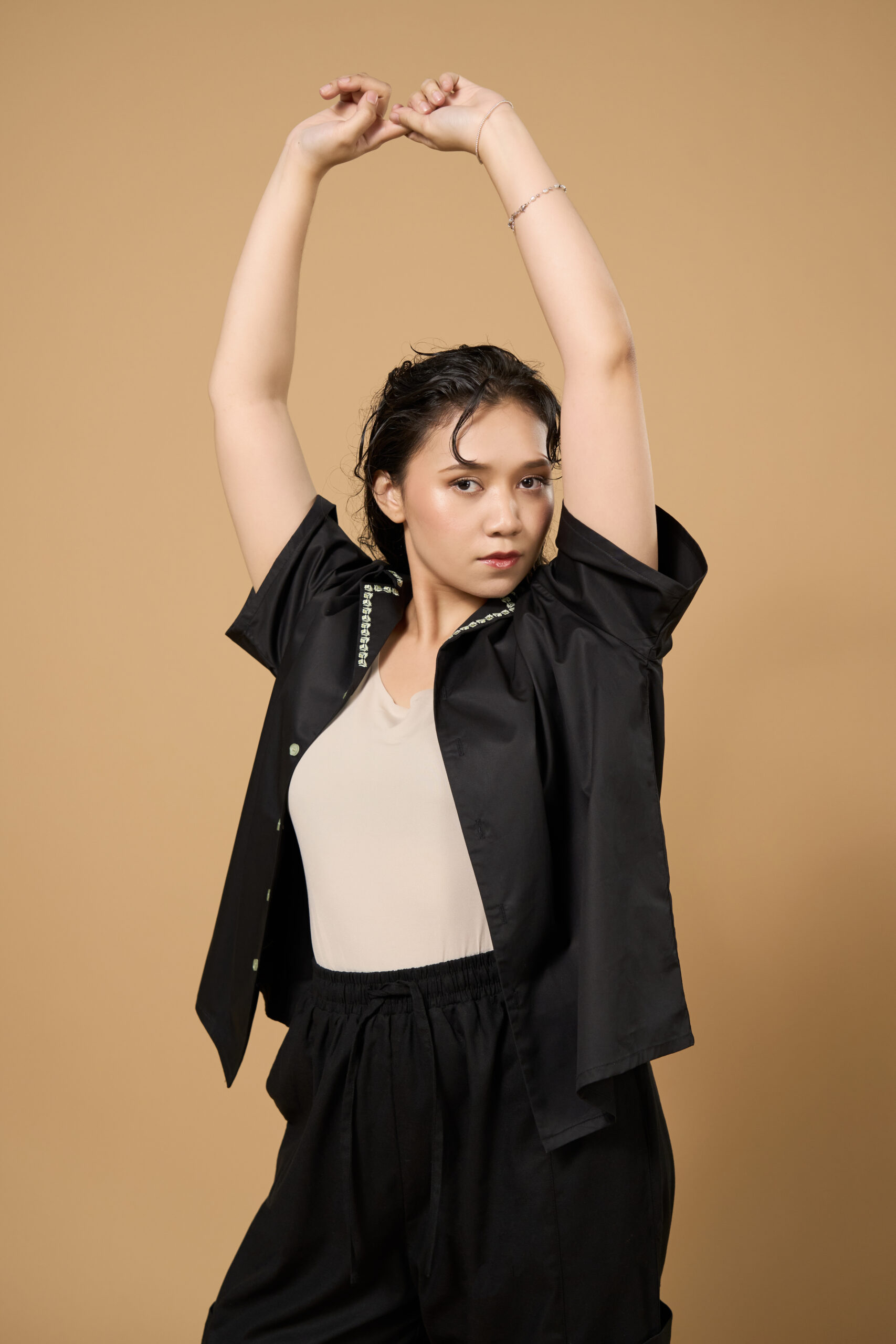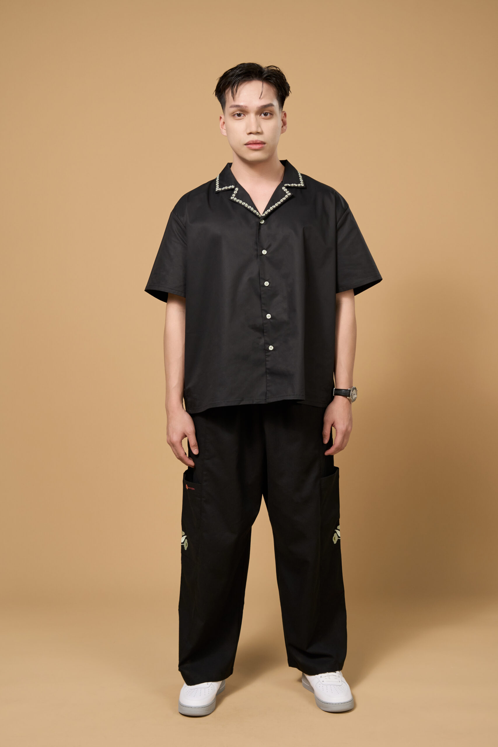 A lightweight shirt in deep Arang Black with delicately scaled Tampuk Mangges embroidery framing the collar — understated yet meaningful. The placement nods to the idea of quiet power — a heritage worn not just on sleeves, but close to the voice. 30% Linen 70% Cotton.